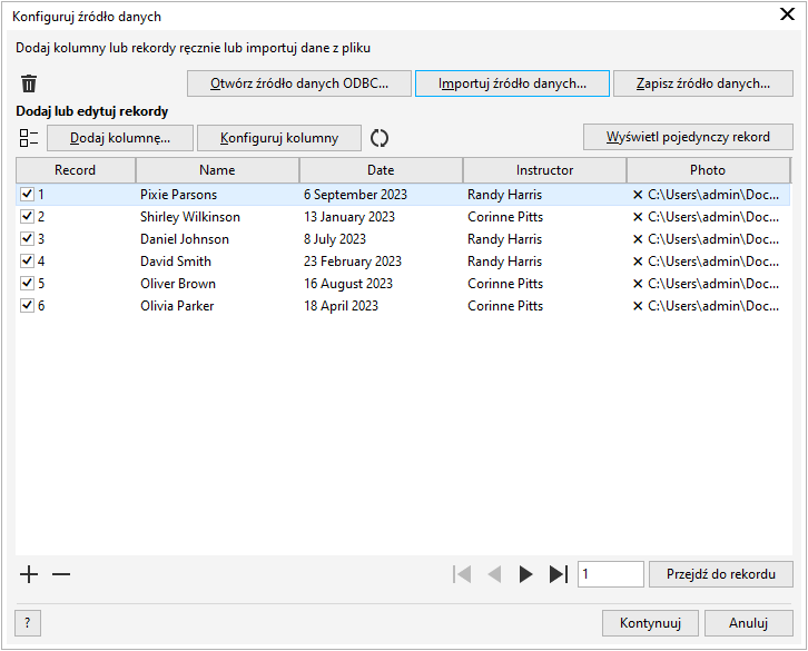 Gdy tworzysz źródło danych w programie CorelDRAW, możesz je zapisać w nowym pliku, co może być pomocne w dostępie do danych i zarządzaniu nimi w edytorze tekstu lub arkuszu kalkulacyjnym. Jeśli chcesz nadpisać istniejący plik, nie może to być plik tylko do odczytu. Możesz zapisać wszystkie lub tylko wybrane rekordy.