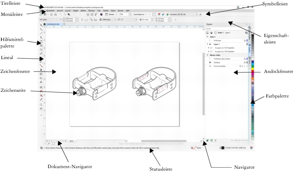 Nachfolgend das Anwendungsfenster von Corel DESIGNER und eine Beschreibung seiner Bestandteile.