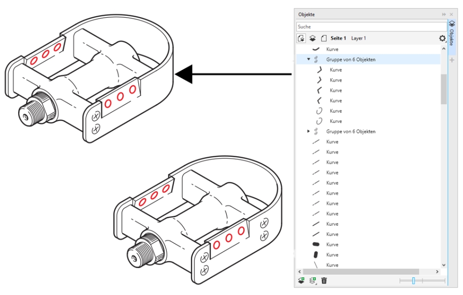 In Corel DESIGNER können Objekte und Objektgruppen ausgeblendet werden, was die Bearbeitung komplexer Projekte und das Experimentieren mit Designs vereinfacht.
