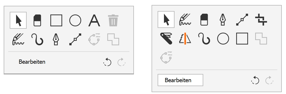 Links: Das Bedienfeld Hilfsmittel. Rechts: Das Bedienfeld Hilfsmittel wurde angepasst. In diesem Fall wurden neue Hilfsmittel hinzugefügt (Beschneiden, Messer und Intelligentes Zeichnen), die Schaltfläche Löschen entfernt und die Hilfsmittel neu angeordnet.
