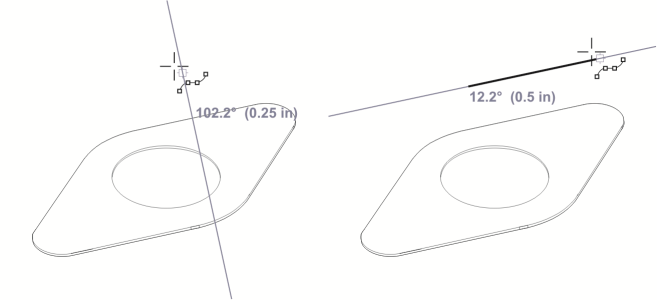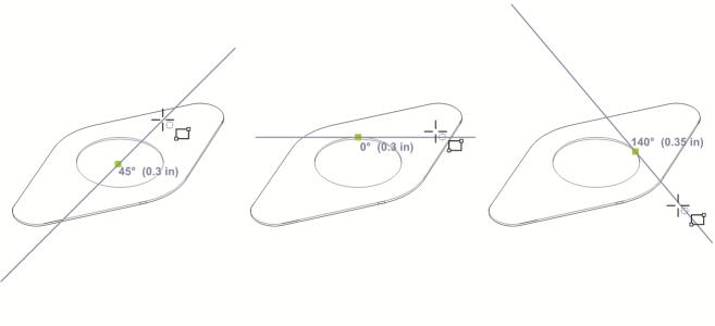 Bewegen Sie den Mauszeiger über den Rand eines Objekts. Wenn der Randeinrastpunkt hervorgehoben wird, drücken Sie H. Zeigen Sie danach die dynamische Hilfslinie an, indem Sie den Mauszeiger vom Einrastpunkt weg bewegen, so als ob Sie eine Tangente zeichnen wollten.