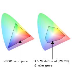 Colors are defined by their color space. 1. Lab color space. 2. sRGB color space, displayed against the Lab color space. 3. U.S. Web Coated (SWOP) v2 color space. 4. ProPhoto RGB color space.