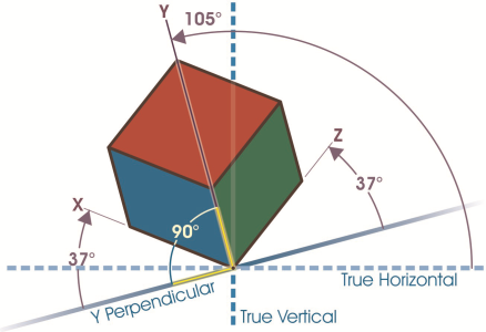 In this example, a drawing profile is depicted. The x-axis is 37° clockwise from a line perpendicular to the y-axis. The y-axis is 105° counterclockwise from the true horizontal. The z-axis is 37° counterclockwise from a line perpendicular to the y-axis. Therefore, the drawing profile has a value of (37,105, 37).
