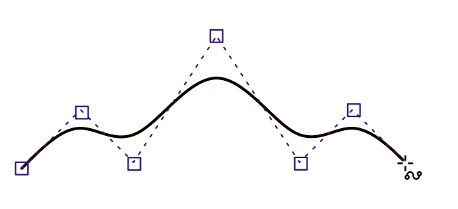 The control points that touch the line are referred to as "clamped". Clamped control points function as anchors. The control points that pull the line but do not touch it are referred to as "floating". The first and last control points are always clamped on open‑ended B-splines. The points in between float by default, but you can clamp points if you want to create cusps or straight lines within the B-spline. You can edit completed B-splines by using the control points.