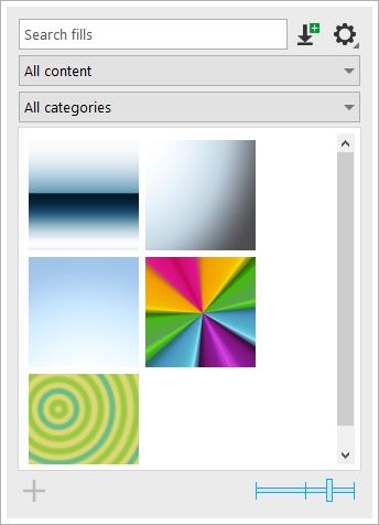 To get you started, Corel provides local fills that are listed under All content in the Fill and Transparency pickers. These fills are stored in your Documents\Corel\Corel Content\Fills folder. If you are looking to expand your fill collection, you can download additional fill packs from within the Get More dialog box.