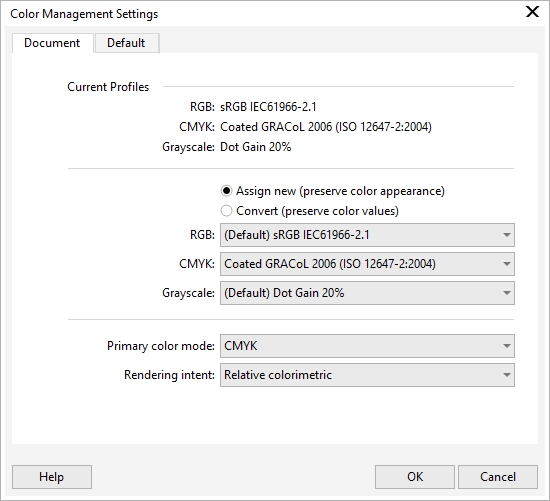 Primary color mode — determines the document color palette that is displayed when you open or start a document as well as the default color mode of a document that is exported as a bitmap. The primary color mode is set for all new and untagged documents, but you can change this setting for the active document on the