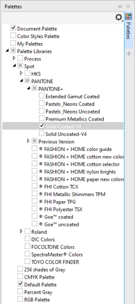 The Palette libraries contain a collection of color palettes. You can control the display of the default color palettes, such as the default RGB and default CMYK color palettes. The main Palette libraries that are included are Process color and Spot color.