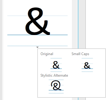 Some glyphs provided by OpenType features vary depending on the context in which they appear and cannot be shown in the Glyphs docker. You can view and insert such glyphs in the document window by using the onscreen OpenType feature indicator. For more information, see To enable the onscreen OpenType feature indicator.