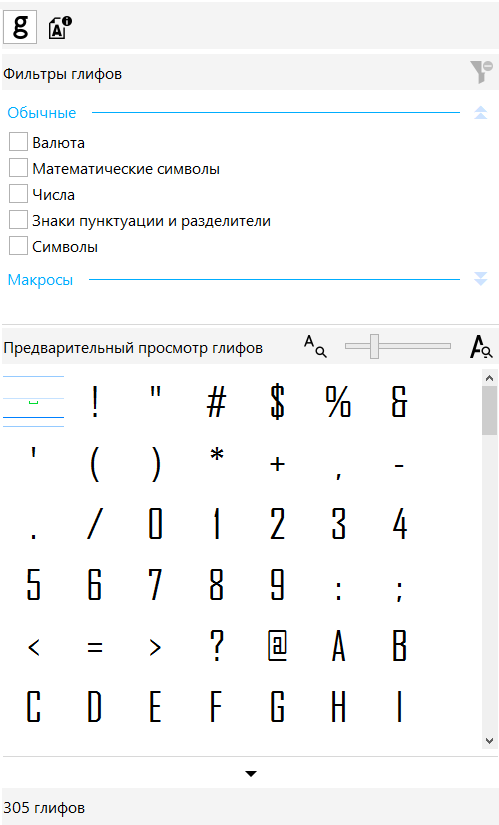 | Если кнопка Набор глифов не отображается, нажмите кнопку Показать свойства шрифта |