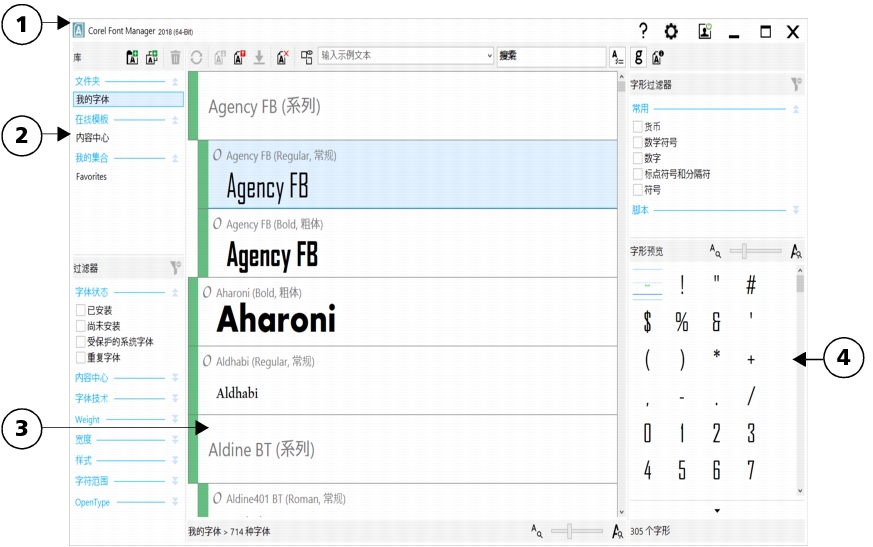 Corel Font Manager 包括以下组件:标题栏 (1)、库窗格 (2)、预览窗格 (3) 和属性窗格 (4)。