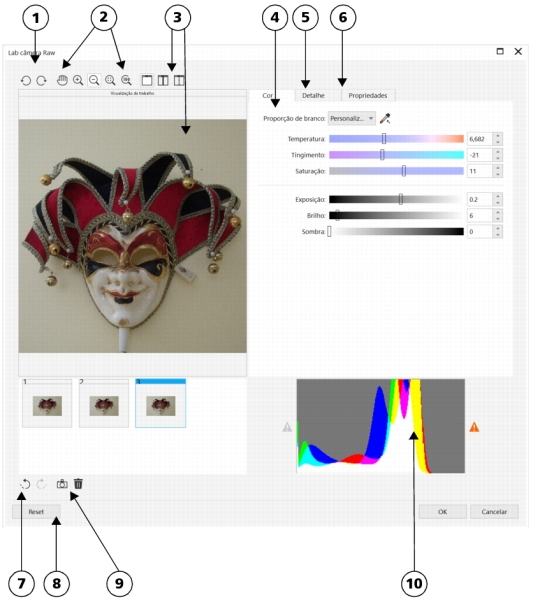 Ao abrir um ou vários arquivos de câmera RAW no Corel PHOTO-PAINT, eles são inicialmente exibidos no Lab de arquivos de câmera RAW. Os controles do Lab de arquivos de câmera RAW podem ser utilizados para ajustar a cor e o tom das imagens de câmera RAW. Se os ajustes feitos em um arquivo forem satisfatórios, é possível aplicar os mesmos ajustes aos demais arquivos.