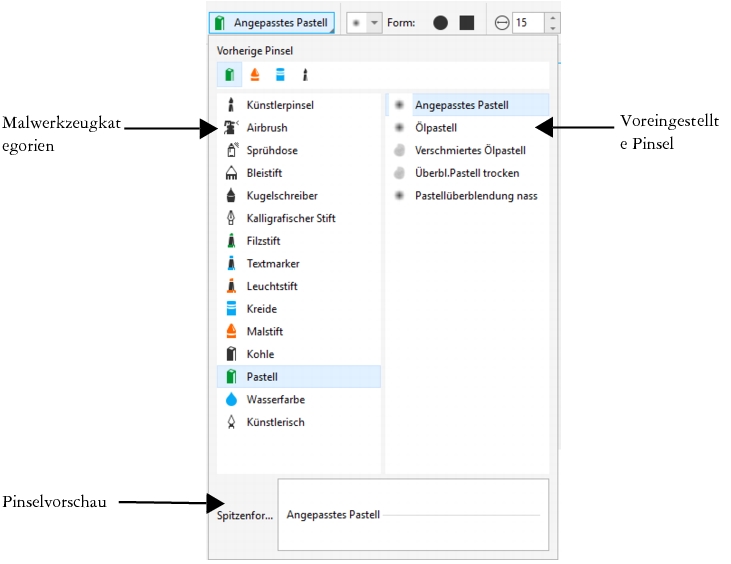 Über die Auswahl Pinsel können Sie voreingestellte, in Pinselkategorien unterteilte Pinsel in der Vorschau anzeigen und auswählen.
