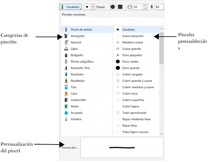 El selector Pincel permite ver una previsualización y seleccionar pinceles preestablecidos, que se organizan en categorías de pinceles.