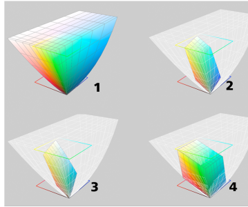 Colors are defined by their color space. 1. Lab color space. 2. sRGB color space, displayed against the Lab color space. 3. U.S. Web Coated (SWOP) v2 color space. 4. ProPhoto RGB color space.