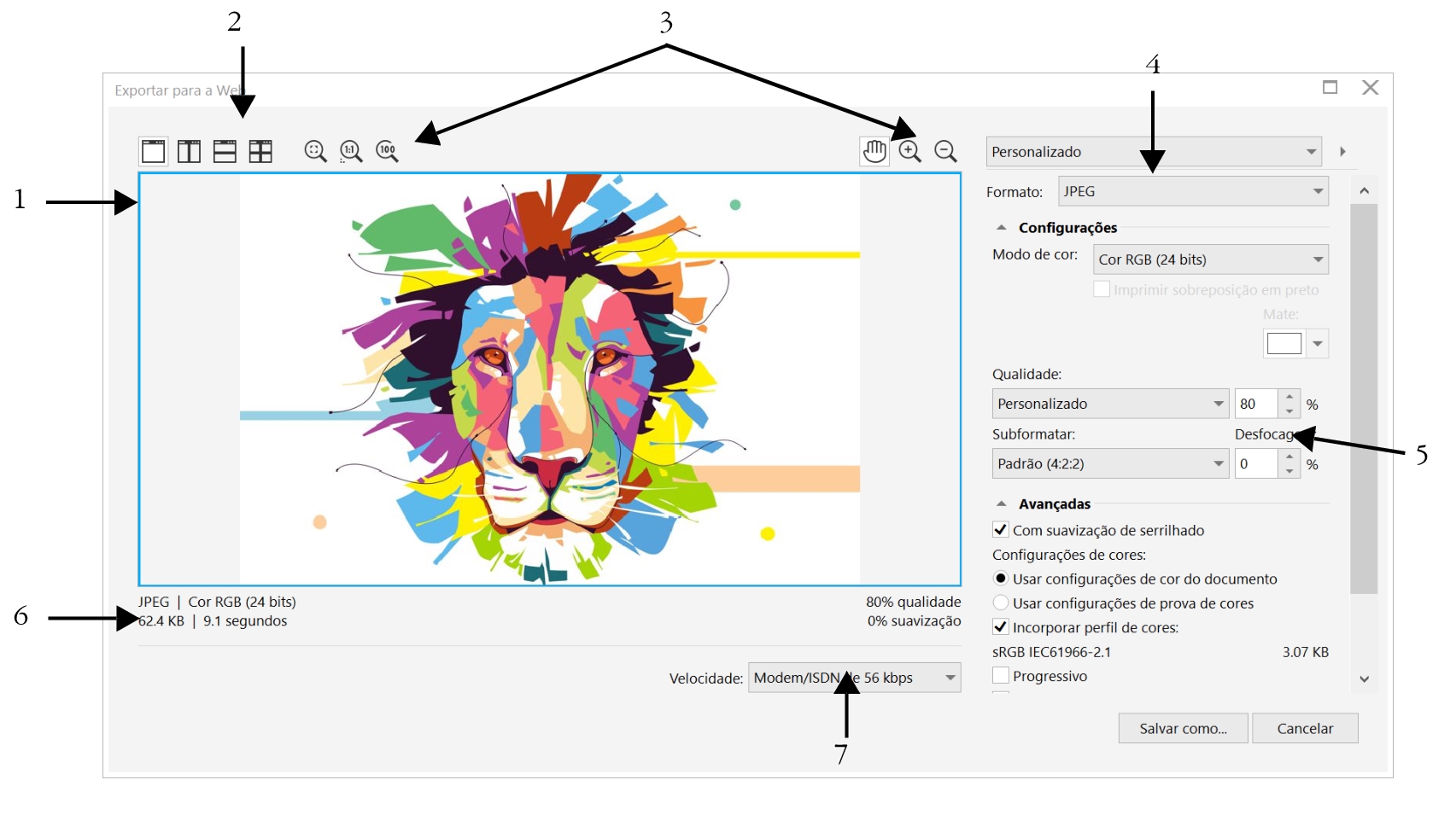 Ao especificar opções de exportação, é possível visualizar uma imagem com até quatro configurações diferentes. É possível comparar formatos de arquivo, configurações predefinidas, velocidades de download, compactação, tamanho do arquivo, qualidade de imagem e faixa de cores. Além disso, você pode examinar as visualizações aplicando zoom e enquadramento dentro das janelas de visualização.