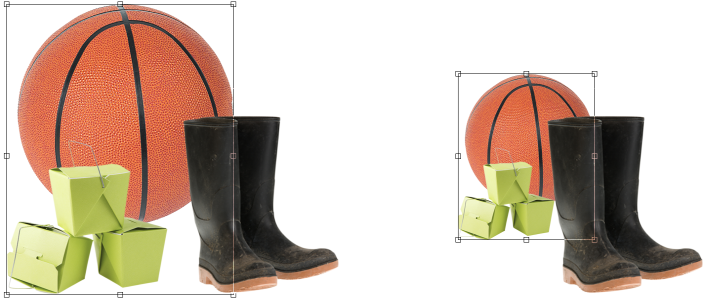 Gruppierte Objekte können zusammen verschoben oder geändert werden. In diesem Beispiel werden der Ball und die Kisten zusammen gruppiert und als Gruppe bezüglich der Größe geändert.