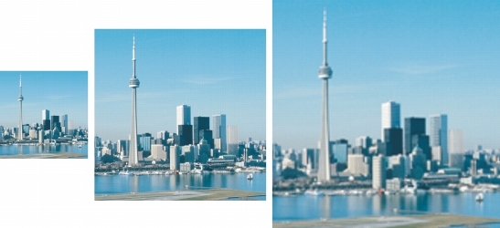 You can change the resolution and size of an image at the same time. Left to right: downsampled image, original image, upsampled image.
