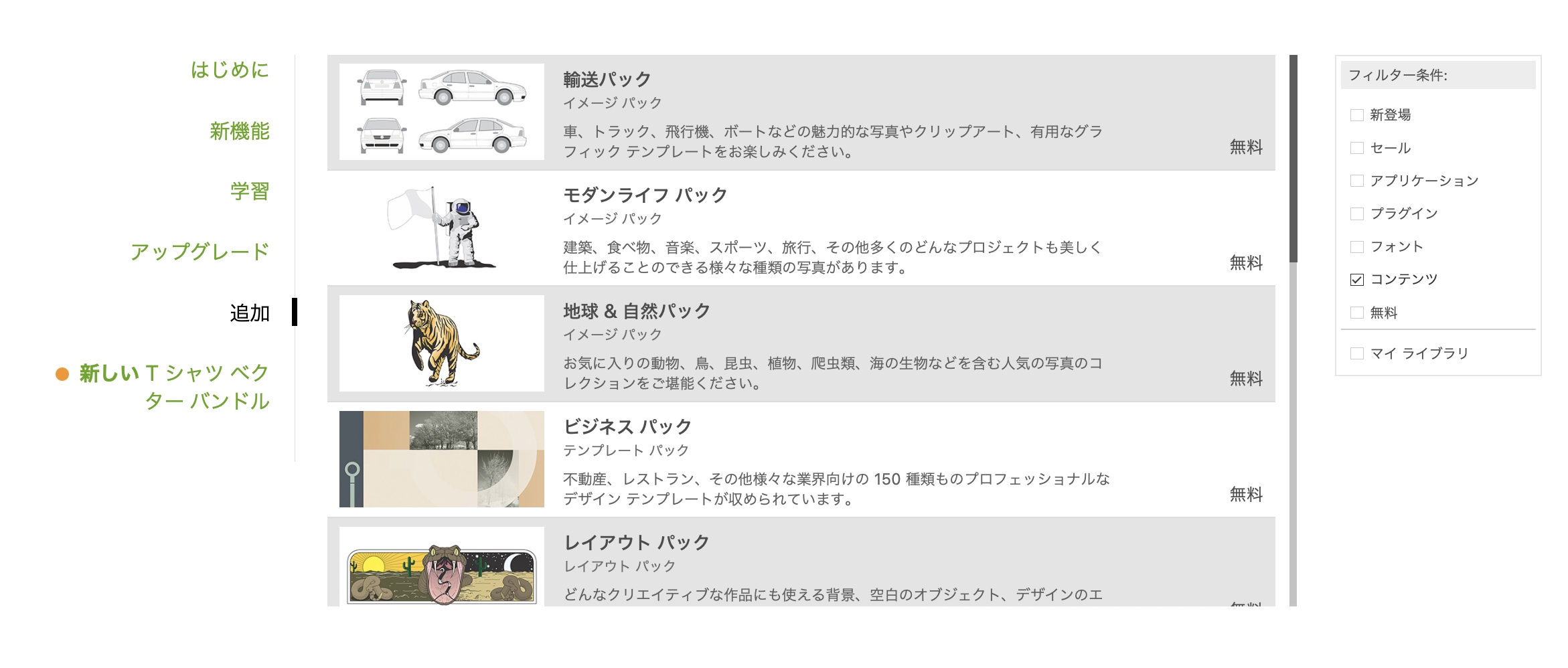 [追加] ダイアログ ボックスを使用して、アプリやプラグインのほか、塗りつぶしパック、イメージ パック (クリップアートやフォト)、フォント パックなどのコンテンツを Corel PHOTO-PAINT 内から直接ダウンロードできます。候補は、新しいアイテムが利用可能になると更新されます。アイテムには、無料のものと有料のものがあります。
