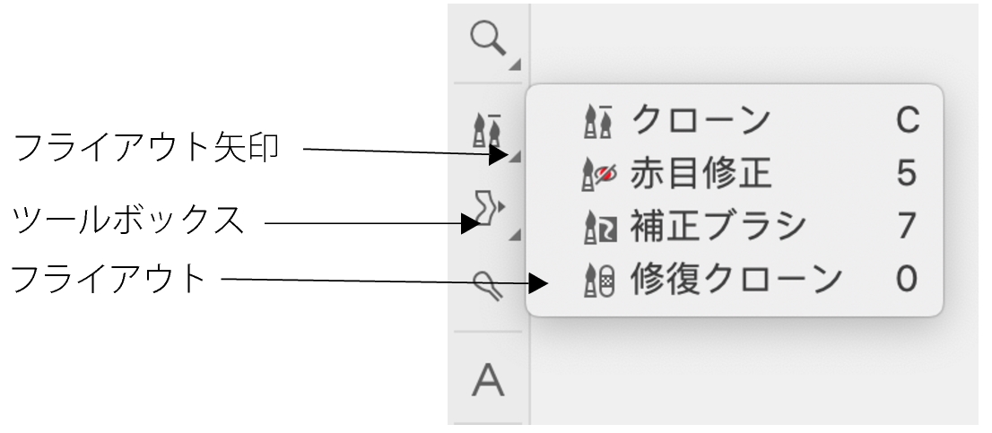 ツールボックスのボタンの右下隅に小さな矢印がある場合は、それがフライアウトであることを示しています。フライアウトでは、最後に使用したツールがツールボックスに表示されます。フライアウトのツールにアクセスするには、ツールボックス ボタンの右下隅に表示される小さな黒い矢印をクリックします。