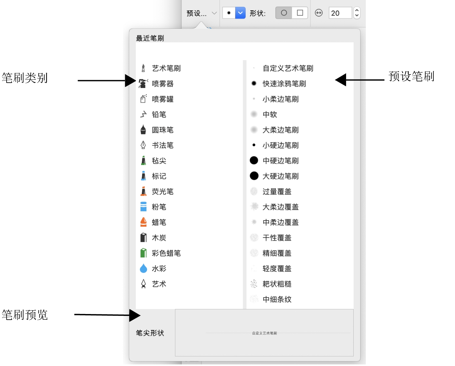 您选择的绘图工具和笔刷类型会决定笔刷笔触在图像上的外观。使用预设笔刷绘画时,绘画工具的笔刷属性是预先设置好的。您可以从笔刷挑选器中选择一种预设笔刷,挑选器中显示所有笔刷类别和预设笔刷。此外,笔刷挑选器还提供笔尖和笔刷笔触预览,并显示最近使用的五种笔刷。