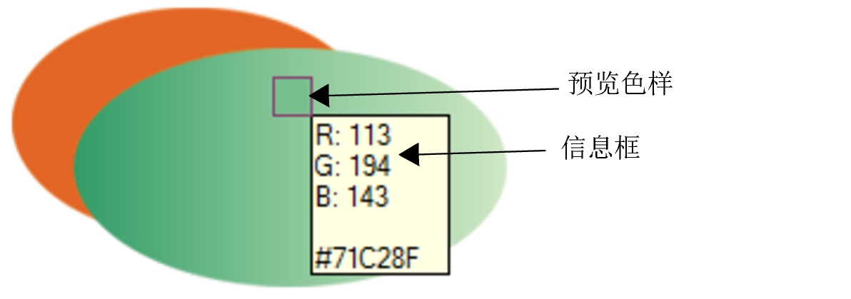在图像窗口中,预览色样与滴管工具相连,还有一个信息框列出了颜色模型的组件值。当您对 RGB 颜色进行取样时,信息框还会包括十六进制颜色值。