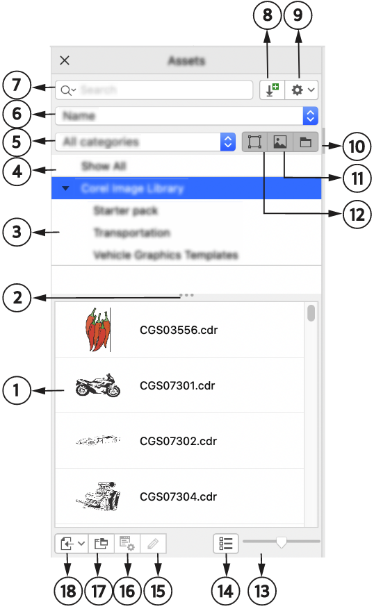 资产)提供了一个中心位置,您可以在此搜索和浏览本地或网络文件夹中以及便携式设备上的矢量和位图图像。"资产"检查器取代了早期版本的 CONNECT 内容检查器。