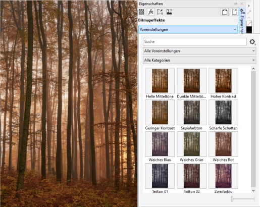 In CorelDRAW können Sie Anpassungsvoreinstellungen aus der Registerkarte FX im Andockfenster 'Eigenschaften anwenden.