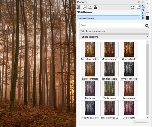 In CorelDRAW, è possibile applicare le preimpostazioni di regolazione dalla scheda FX nella finestra mobile Proprietà.