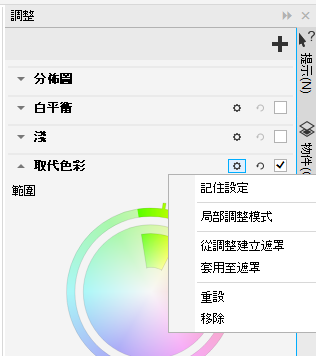 如果您經常使用相同的調整而且您想要在處理每個影像時都可以方便存取這些調整,您可以選擇預設在「調整」泊塢視窗中顯示它們。