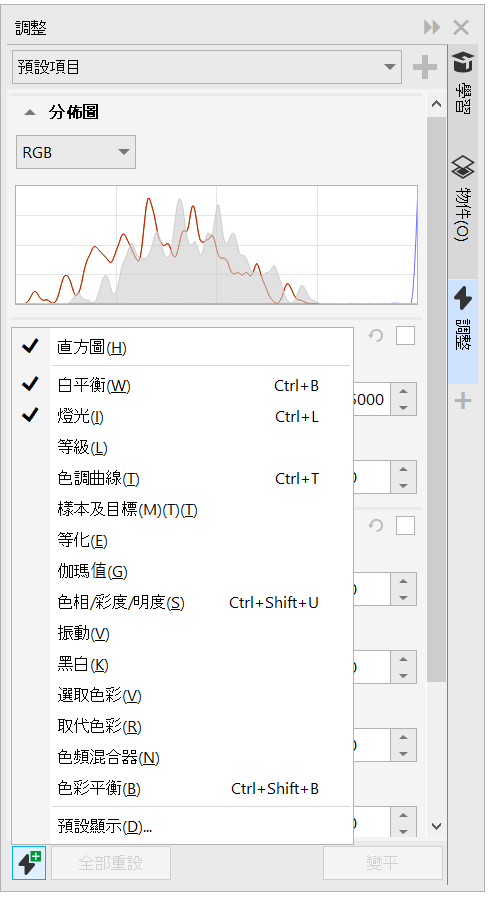 「分佈圖」、「白平衡」和「光源」調整預設會顯示在「調整」泊塢視窗中,但是您可以隨時加入更多調整。您也可以移除調整。