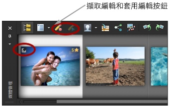 在「調整」或「編輯」工作區內編輯相片時,相片縮圖上會出現一個小小的編輯圖示。回到「管理」工作區時,可以存取「擷取」編輯和「套用」編輯指令來複製變更至其他相片。