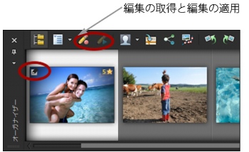 調整や編集のワークスペースで写真を変更すると、小さな編集アイコンが写真のサムネイルに表示されます。管理ワークスペースに戻ると、編集の取得と編集の適用のコマンドを使用して変更を他の写真へコピーすることができます。