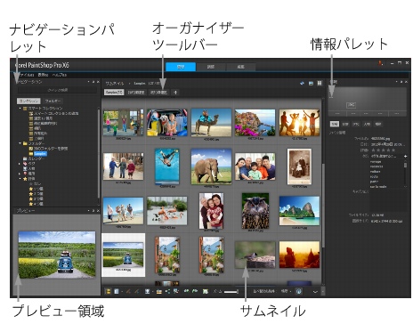 Corel PaintShop Pro を初めて起動すると、管理ワークスペースが以下の 4 つのコンポーネントからなるメインワークスペースとして表示されます。ナビゲーションパレット、プレビュー領域、オーガナイザーパレット、および情報パレット。これらのパレットの詳細については、管理ワークスペースを参照してください。
