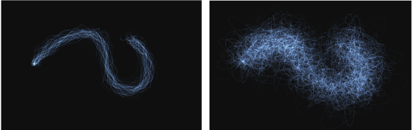 Mit dem Regler Drehgeschwindigkeit wird die Geschwindigkeit festgelegt, mit der die Partikel sich um den Cursor drehen. Bei niedrigeren Drehgeschwindigkeiten folgen die Partikel dem Cursor dichtauf, bei höheren Drehgeschwindigkeiten können sich die Partikel weiter vom Cursor wegbewegen.