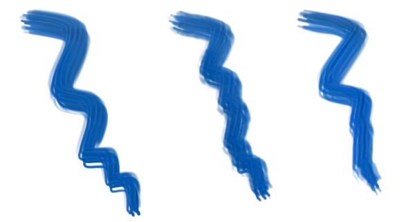 Beispiel-Malstriche von links nach rechts: ohne Radiusverstreuung, mit Radiusverstreuung sowie mit Radiusverstreuung und Glätte