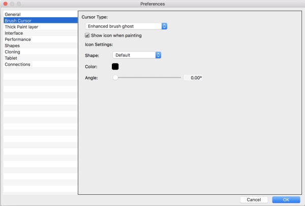 The Enhanced brush ghost displays a representation of a brush variant when the Brush tool is selected, but not actively painting. The instant you start applying media, the Enhanced brush ghost changes to an icon. This delivers a more responsive creative experience, without any lag time, by using strokes that always track directly beneath your stylus. For more information about brush cursor settings, see Brush cursor preferences.