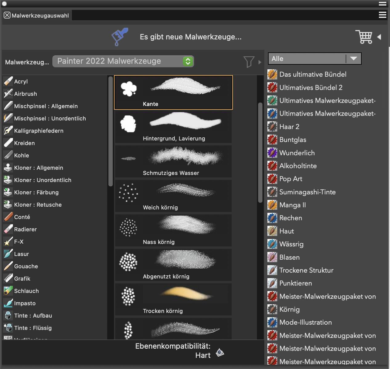 Sie können Ihre Malwerkzeugsammlung erweitern, indem Sie direkt in Corel Painter kreative Malwerkzeugpakete erwerben.