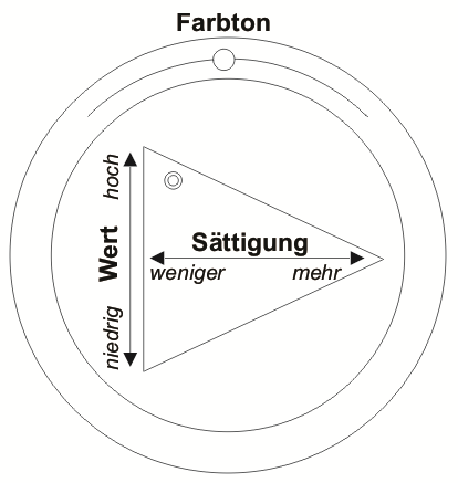 Ziehen Sie den Cursor innerhalb des Farbtonrings, um einen Farbton auszuwählen. Ziehen Sie den Cursor innerhalb des Helligkeits-/Sättigungsdreiecks, um die Sättigung festzulegen.