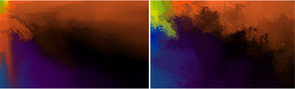 Corel Painter 2016 では、用紙テクスチャとフロー マップの角度を変更することで、ブラシストロークのタッチをより多様に変化させることが可能になりました。詳しくは、用紙テクスチャを回転する および フロー マップをカスタマイズする. を参照してください
