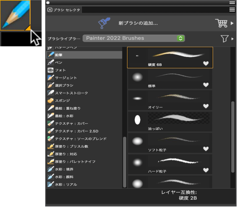 ブラシセレクタ (左) で、ブラシ カテゴリとブラシ バリアント (右) を選択できます。