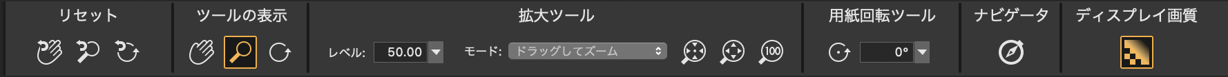 ツールボックスから手のひらツールを選択したときのプロパティ バー