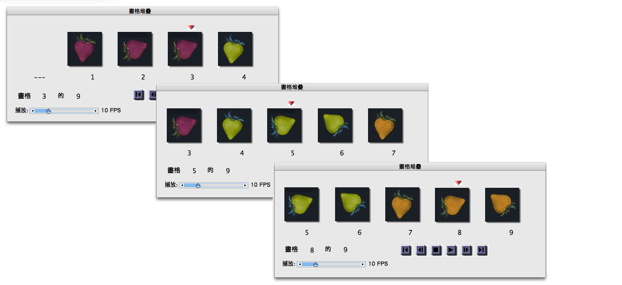 您必須根據第二階的需要,將影像元素排列成組。在下例中,新噴嘴的第二階漸進式排列為更改色彩。動畫用三個色彩集組織。畫格 1 到 3 形成紅色組;畫格 4 到 6 形成綠色組,而畫格 7 到 9 則形成黃色組。每一組都是新噴嘴的第二階漸進式排列 (更改角度),並包含色彩相同、但是以不同的角度放置的影像。