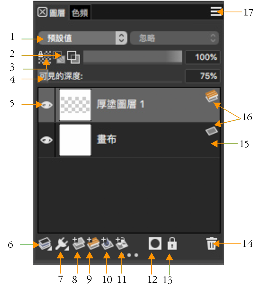 文件中的所有圖層均列示在「圖層」面板上。「圖層」面板可讓您管理圖層。它包含了選取、隱藏、鎖定、刪除、命名和將圖層設成群組等指令與控制項。透過使用面板底部的按鈕,以及用滑鼠右鍵按一下圖層時顯示的內容選單,您可以存取各種圖層指令和控制項。