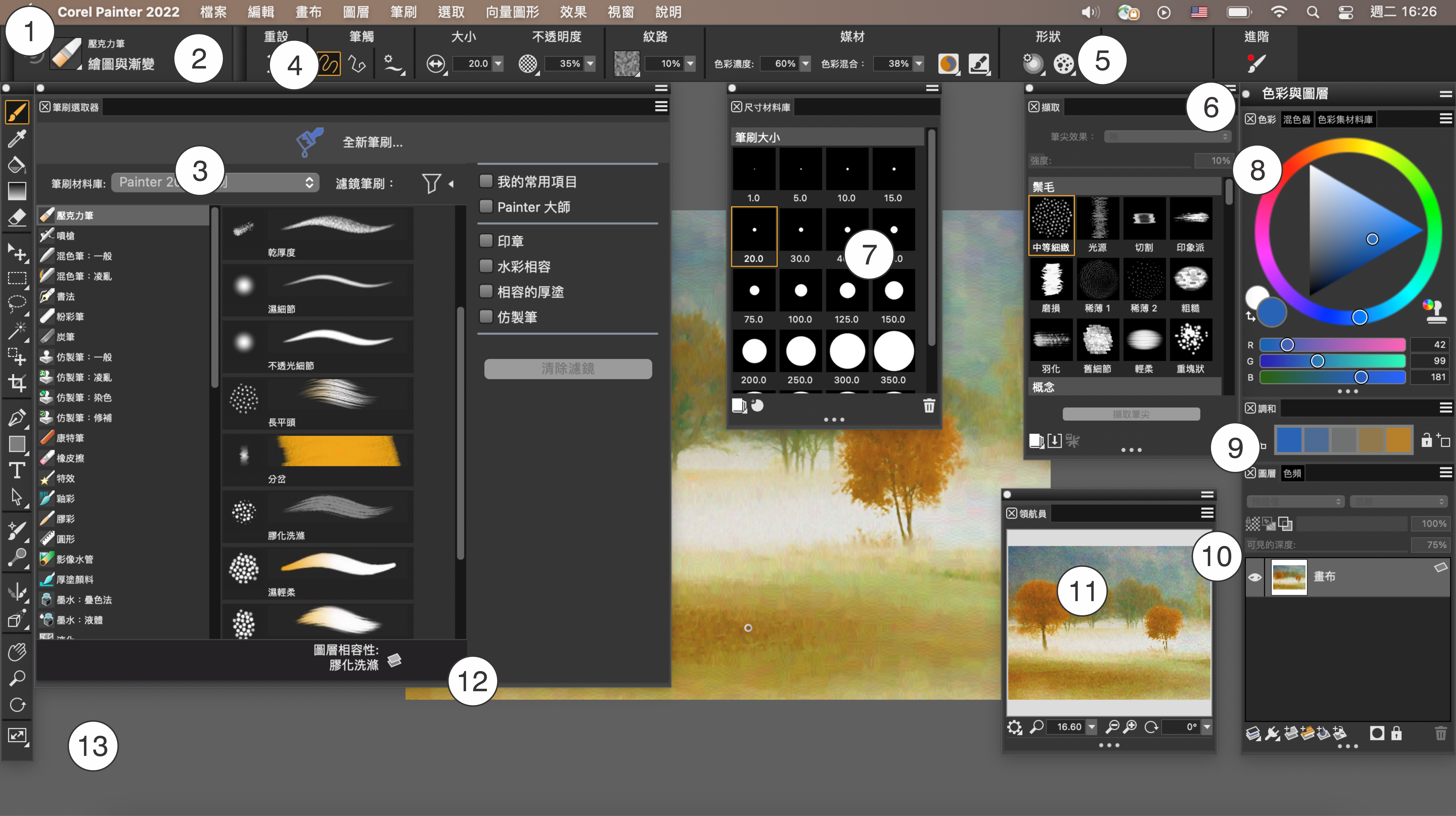 圈起來的數字可對應至下表中的數字,這些數字說明應用程式視窗的主要元件。