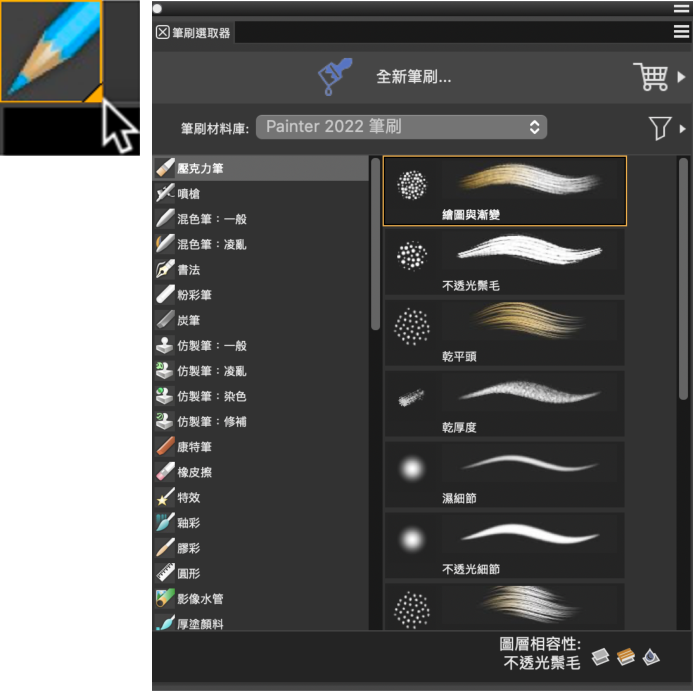 「刷選取器」列 (左) 可讓您選擇筆刷類別和筆刷變體 (右)。