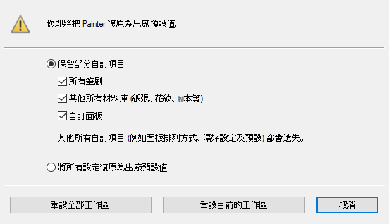 「保留部分自訂內容」選項。您可以選擇保留自訂筆刷、自訂面板和自訂材料庫 (紙張、花紋、腳本、材質等項目)。
