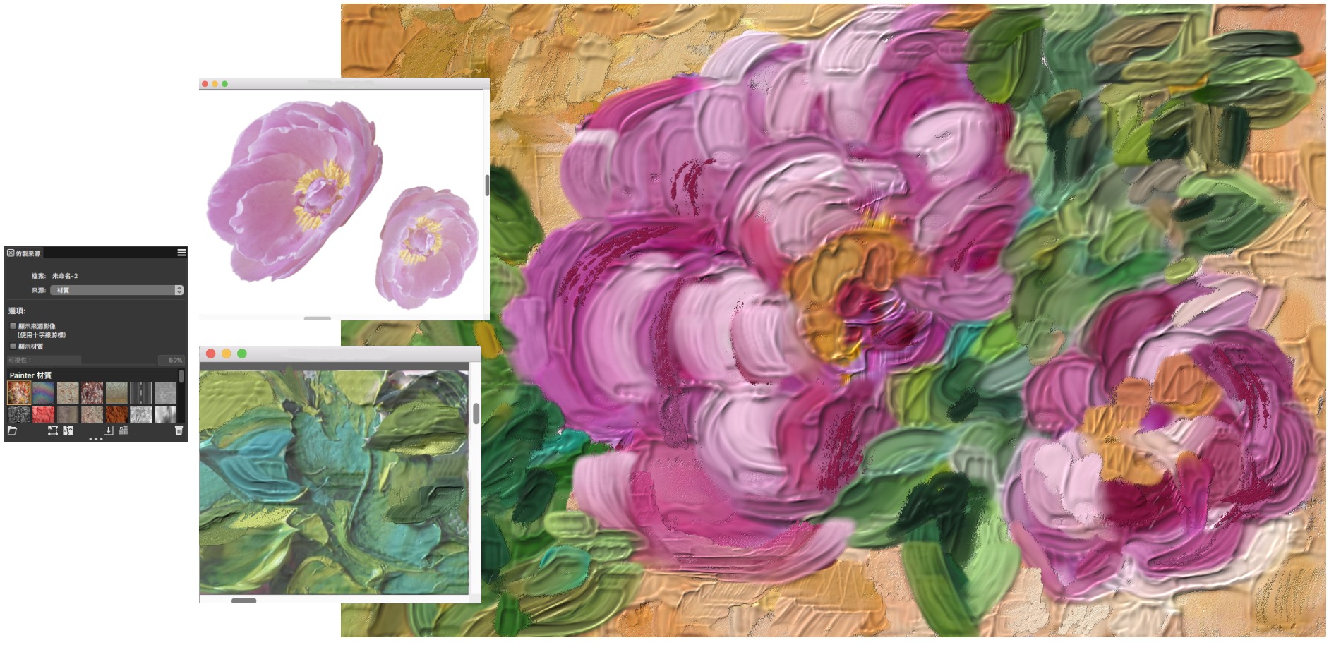 建立您的內容資產,將其輸入「材質」材料庫,並在您的繪圖或照片拼貼中將其做為仿製來源使用。