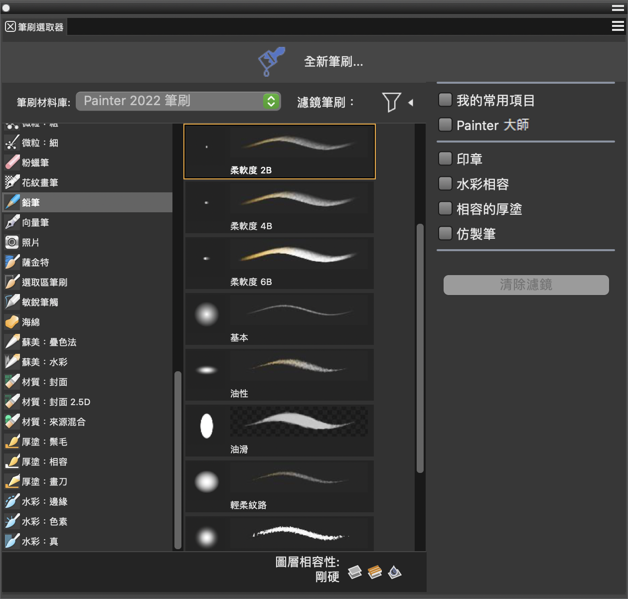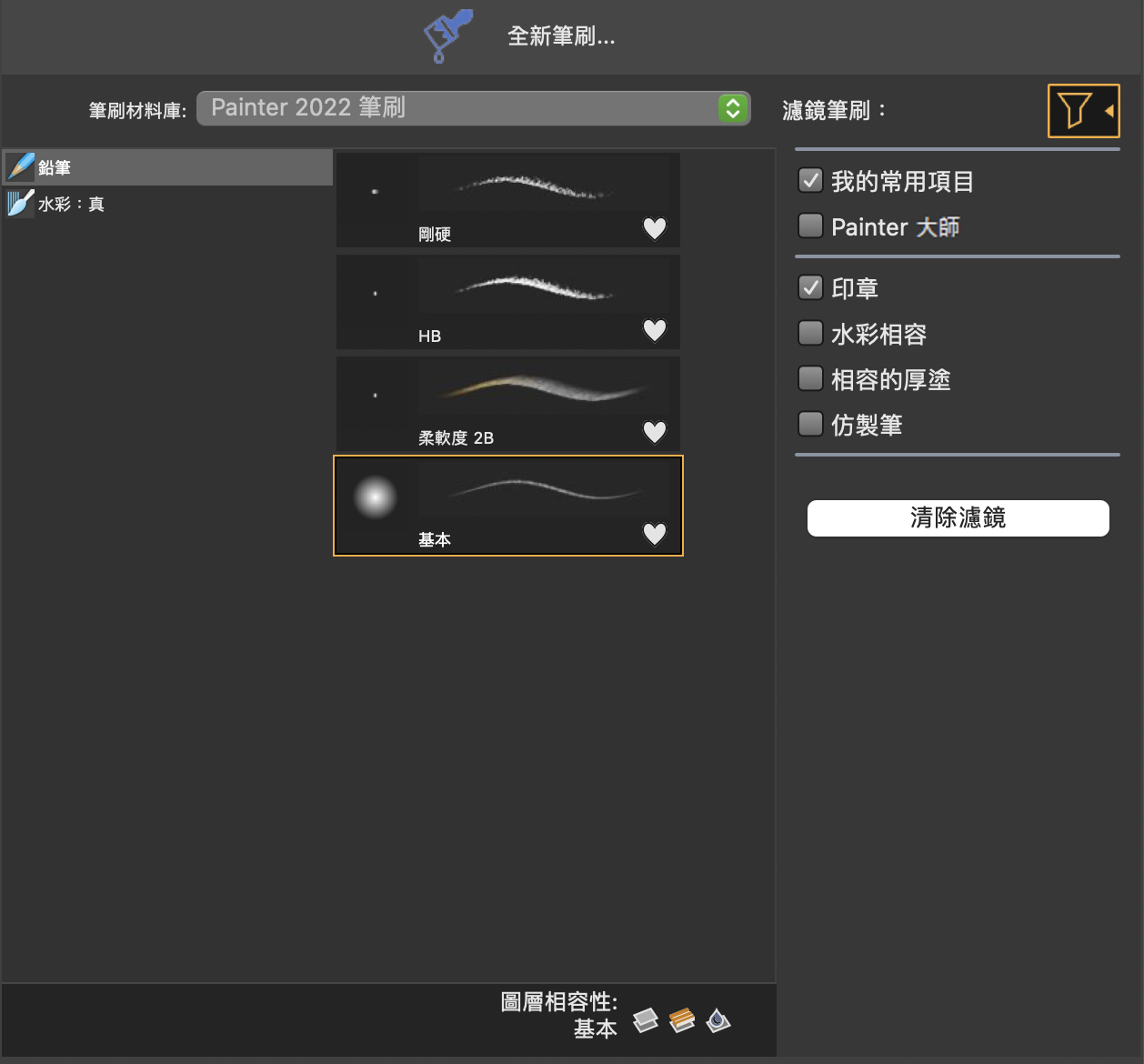 快速建立您自己的最愛筆刷清單,然後使用「我的最愛」過濾器,將筆刷材料庫刪減為您的個人基本材料庫。善用「Painter 大師」過濾器,體驗由知名 Painter 畫家所精挑細選的大量筆刷。您也可以快速隔離印章式、「水彩」、「厚塗相容」以及「仿製筆」筆刷。相關詳細資訊,請參閱過濾筆刷.