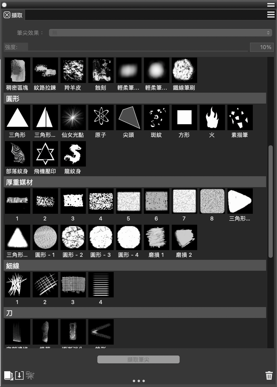 全新的「擷取」面板提供了無窮的嘗試機會,可讓您自訂筆刷筆尖的外觀。共有 12 個新的擷取筆尖材料庫可供選擇:「鬃毛」、「概念」、「平頭」、「一般」、「圖形」、「厚重媒材」、「交錯」、「畫刀」、「光線」、「自然」、「噴灑」和「海綿」。您可以立即變更任何筆刷的筆尖形狀、調整設定、套用新的筆尖效果,甚至還能擷取新的筆尖以搭配其他筆刷使用。
