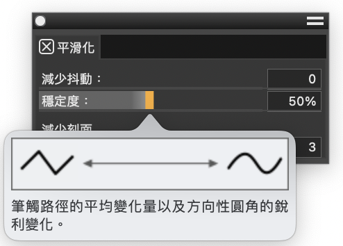 新的「抖動減少」選項會加入平滑控制項,以及現有選項的更新名稱,這些名稱更能反映其個別的效果。面板也會提供更新的工具提示和圖形,能更容易柔化筆刷筆觸的外觀。相關詳細資訊,請參閱平滑控制項.